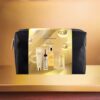 We have packed the 5D Smoothing Ritual products in a black cosmetic bag.ย This bag is practical and comfortable, it can hold a large number of different products (measurements 22 cm wide / 14 cm high / 7 cm deep).ย The cosmetic bag is made of black satin, on the front panel there is a gold plate bearing the emblem of our brand.ย the contents are made of waterproof material and the lock pendant is gold, decorated with the D’DIFFERENCE logo.