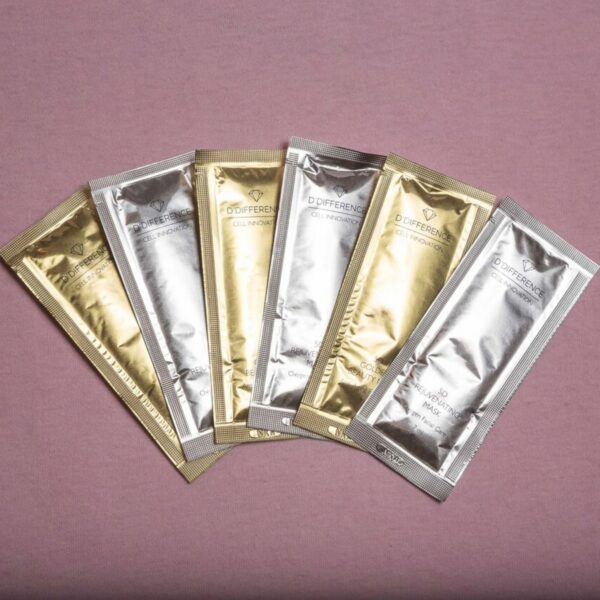 Display of 5D Cell Innovation bubble masks from DDIFFERENCE with the party pack showing its golden side and two masks out, one is silver oxygenating face mask and other golden beauty face mask with anti ageing properties.